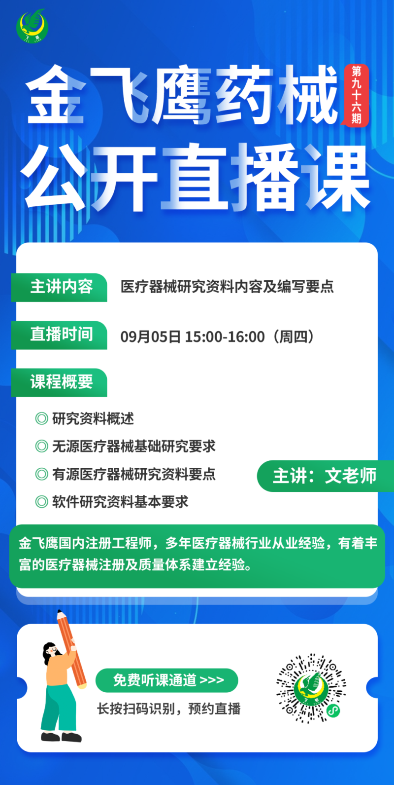 金飛鷹直播培訓(xùn),是每周一次的固定培訓(xùn)欄目,優(yōu)選金飛鷹國內(nèi)外資深注冊(cè)/項(xiàng)目老師定期為大家講解醫(yī)療器械注冊(cè)相關(guān)知識(shí),解答大家在醫(yī)療器械注冊(cè)過程中的諸多疑問。