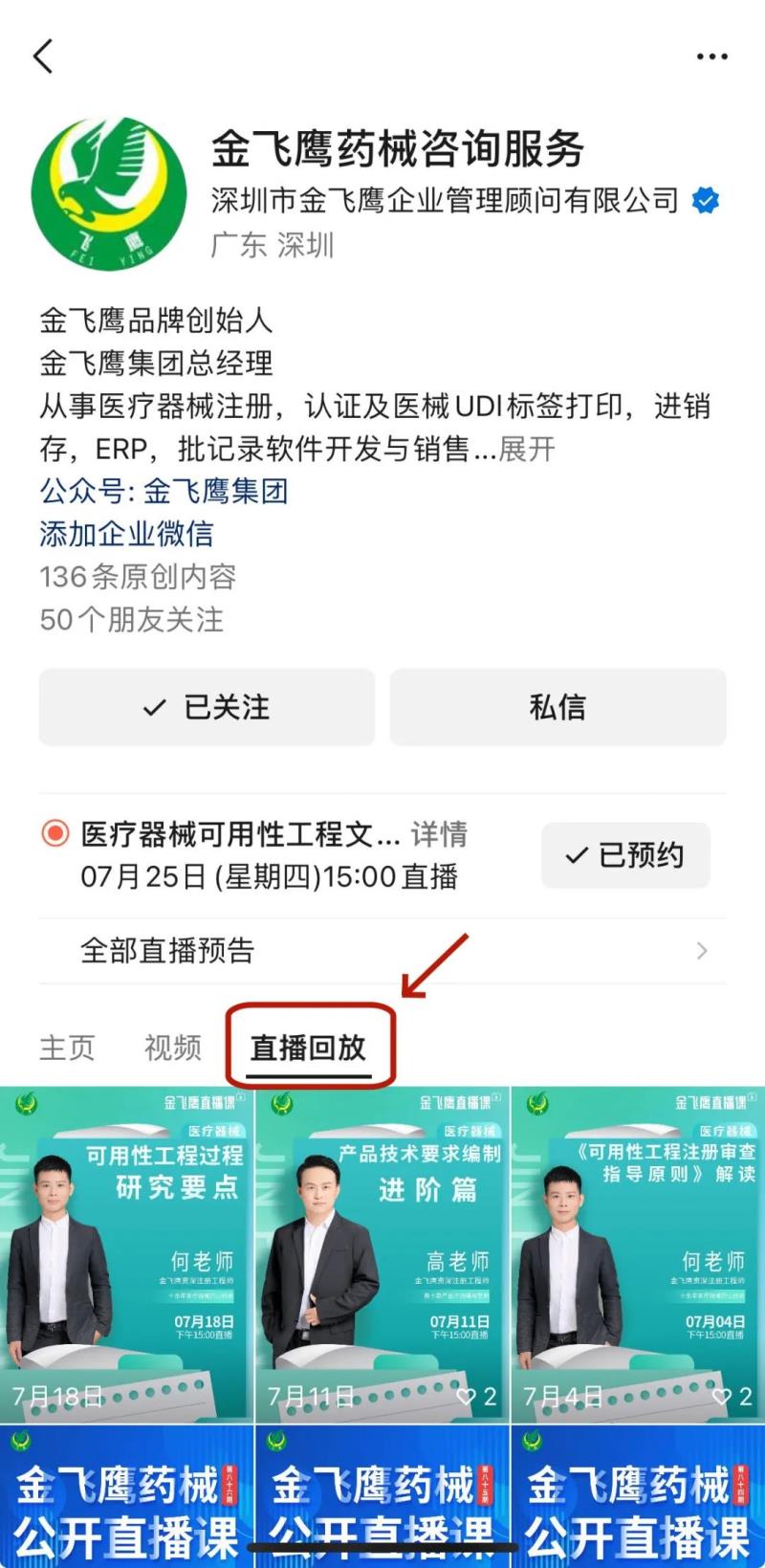 往期直播培訓課程支持回放,關(guān)注“金飛鷹藥械咨詢服務”視頻號并點擊視頻號主頁,即可查看“直播回放”哦~