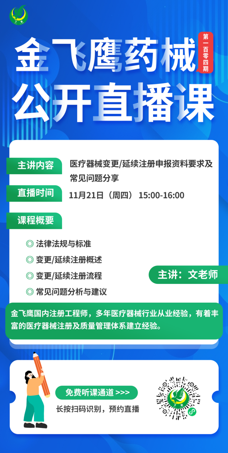 金飛鷹直播培訓(xùn),是每周一次的固定培訓(xùn)欄目,優(yōu)選金飛鷹國內(nèi)外資深注冊(cè)/項(xiàng)目老師定期為大家講解醫(yī)療器械注冊(cè)相關(guān)知識(shí),解答大家在醫(yī)療器械注冊(cè)過程中的諸多疑問。