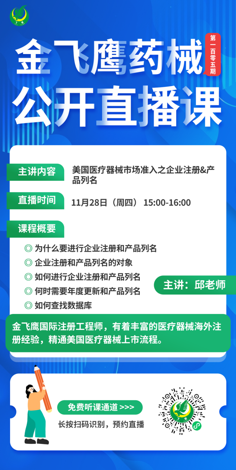 金飛鷹直播培訓,是每周一次的固定培訓欄目,優(yōu)選金飛鷹國內外資深注冊/項目老師定期為大家講解醫(yī)療器械注冊相關知識,解答大家在醫(yī)療器械注冊過程中的諸多疑問。