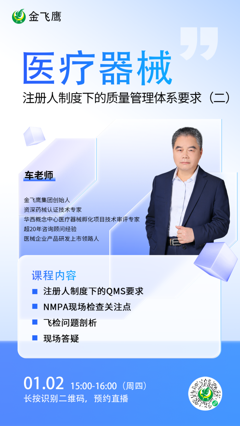 金飛鷹直播培訓(xùn),是每周一次的固定培訓(xùn)欄目,優(yōu)選金飛鷹國內(nèi)外資深注冊/項目老師定期為大家講解醫(yī)療器械注冊相關(guān)知識,解答大家在醫(yī)療器械注冊過程中的諸多疑問。