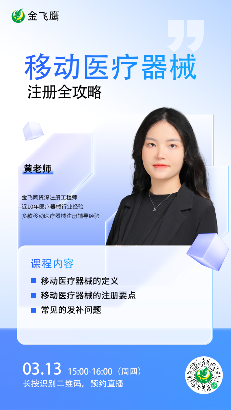 金飛鷹直播培訓(xùn),是每周一次的固定培訓(xùn)欄目,優(yōu)選金飛鷹國(guó)內(nèi)外資深注冊(cè)/項(xiàng)目老師定期為大家講解醫(yī)療器械注冊(cè)相關(guān)知識(shí),解答大家在醫(yī)療器械注冊(cè)過(guò)程中的諸多疑問(wèn)。