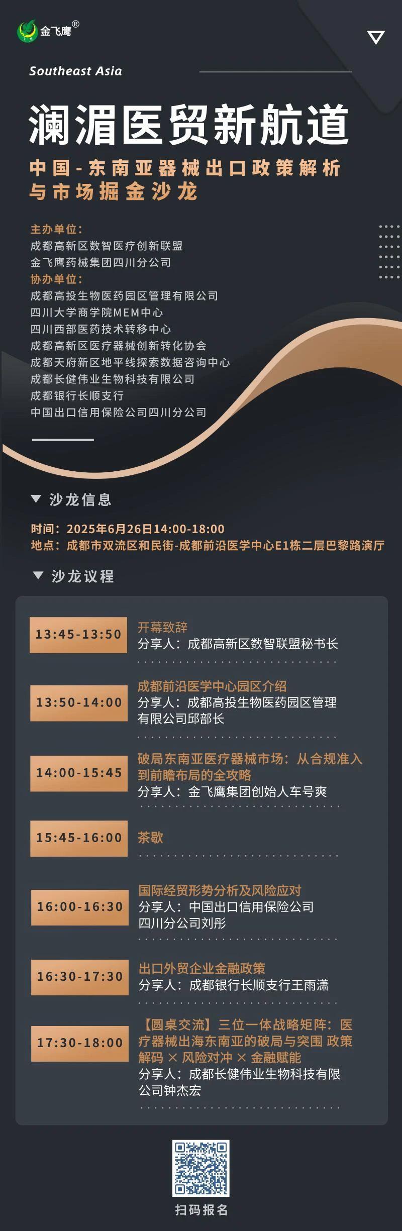 為助力國內(nèi)醫(yī)療器械企業(yè)把握這一黃金機遇,我們聯(lián)合成都高新區(qū)數(shù)智醫(yī)療創(chuàng)新聯(lián)盟特別策劃了“瀾湄醫(yī)貿(mào)新航道——中國-東南亞器械出口政策解析與市場掘金沙龍”,本次沙龍由成都高新區(qū)數(shù)智醫(yī)療創(chuàng)新聯(lián)盟、金飛鷹藥械集團四川分公司主辦,成都高投生物醫(yī)藥園區(qū)管理有限公司、四川大學商學院MEM中心、四川西部醫(yī)藥技術(shù)轉(zhuǎn)移中心、成都高新區(qū)醫(yī)療器械創(chuàng)新轉(zhuǎn)化協(xié)會、成都天府新區(qū)地平線探索數(shù)據(jù)咨詢中心、成都長健偉業(yè)生物科技有限公司、成都銀行長順支行、中國出口信用保險公司四川分公司協(xié)辦,誠邀廣大行業(yè)同仁與我們共同探討這片百億藍海市場的掘金之道!