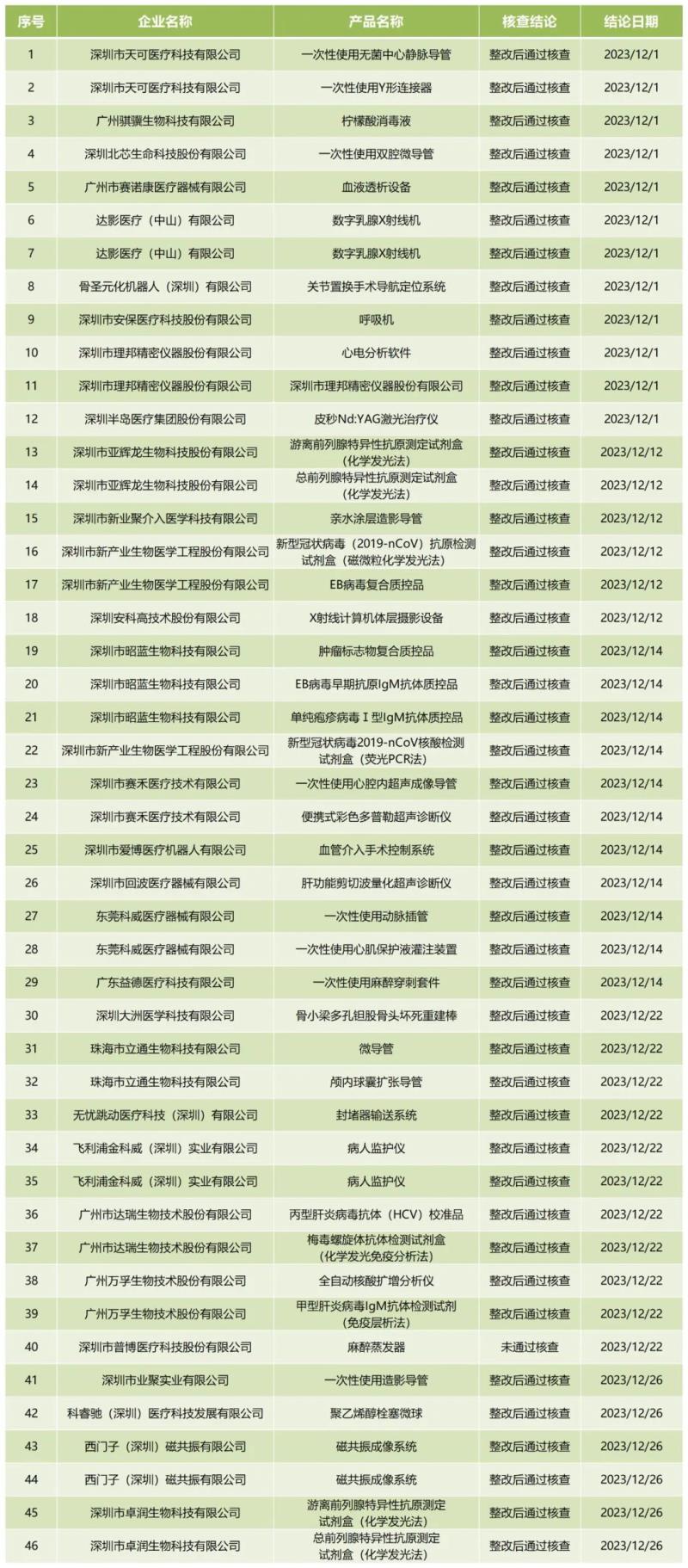 1月22日,廣東省藥監(jiān)局官網(wǎng)公布2023年12月醫(yī)療器械注冊質(zhì)量管理體系核查結(jié)果,包括深圳半島醫(yī)療集團(tuán)股份有限公司、深圳市新產(chǎn)業(yè)生物醫(yī)學(xué)工程股份有限公司、飛利浦金科威(深圳)實(shí)業(yè)有限公司在內(nèi)的30家公司共計(jì)46款產(chǎn)品,其中45款產(chǎn)品為“整改后通過核查”,有一款產(chǎn)品“未通過核查”。具體明細(xì)見下方表格: