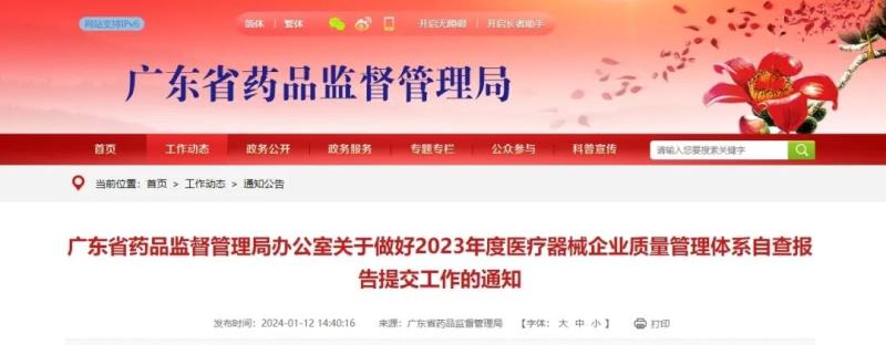 近日,廣東省藥監(jiān)局官網(wǎng)發(fā)布《關(guān)于關(guān)于做好2023年度醫(yī)療器械企業(yè)質(zhì)量管理體系自查報告提交工作的通知》,有關(guān)事項如下: