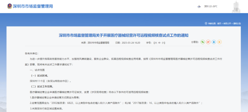 3月24日,深圳市市場監(jiān)督管理局發(fā)布《關(guān)于開展醫(yī)療器械經(jīng)營許可遠程視頻核查試點工作的通知》,具體內(nèi)容如下: