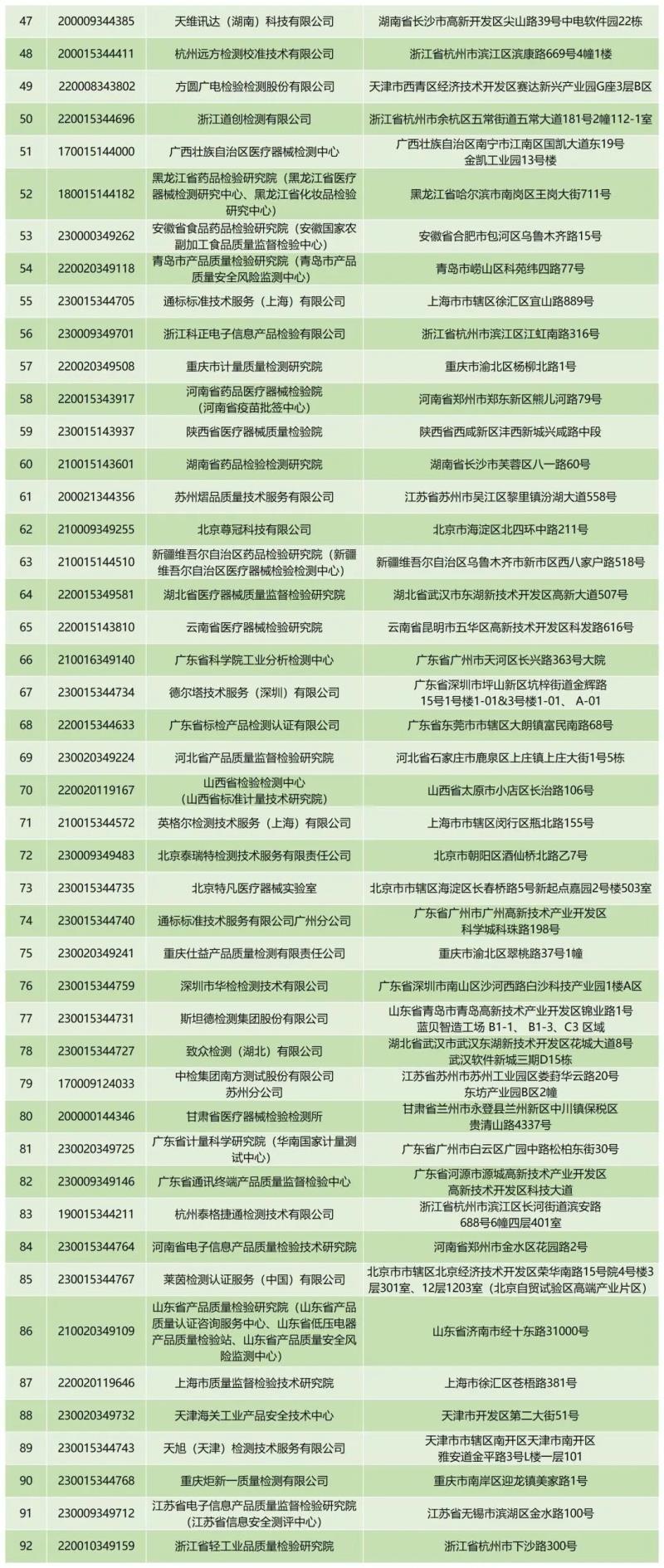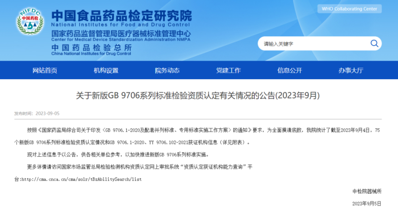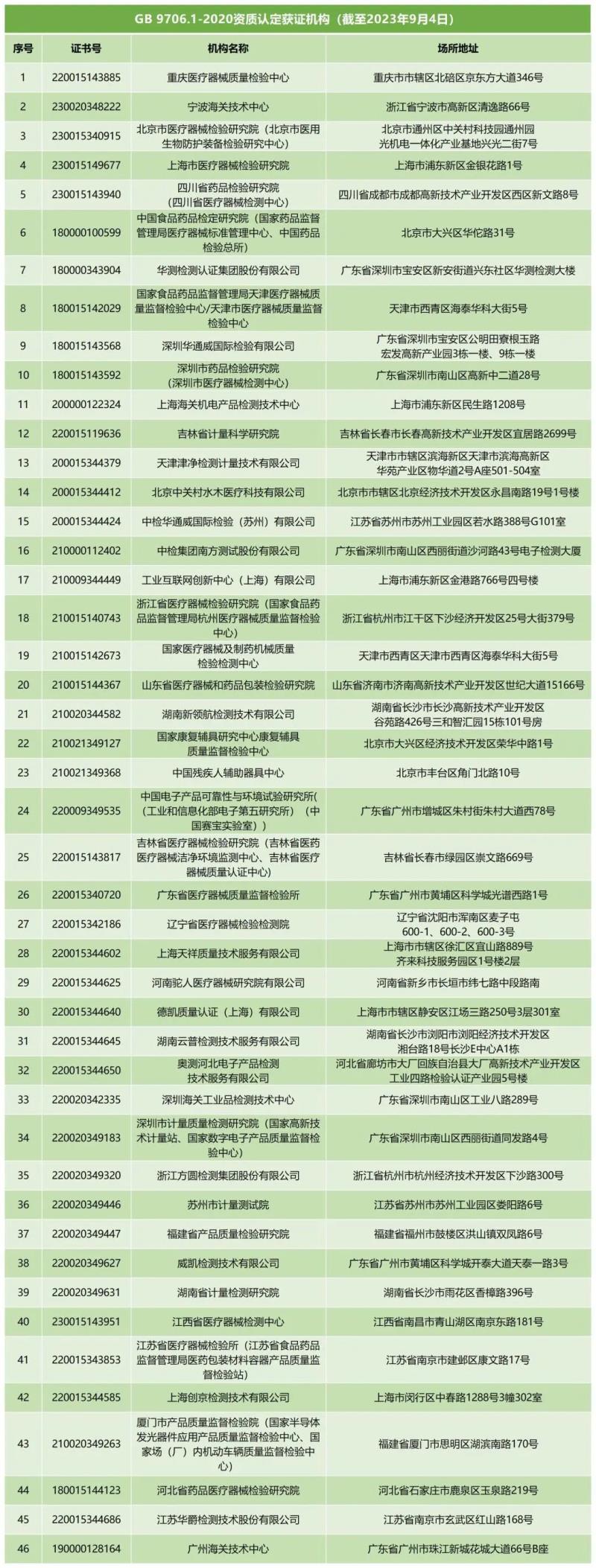 9月5日,中檢院官網(wǎng)公布了截至2023年9月4日,75個新版GB 9706系列標(biāo)準(zhǔn)檢驗資質(zhì)認(rèn)定情況和GB 9706.1-2020、YY 9706.102-2021獲證機構(gòu)信息。我們從附件表格中可以看到,全國共有92家GB 9706.1-2020資質(zhì)認(rèn)定獲證機構(gòu),也就是說,可以承擔(dān)新標(biāo)的安規(guī)檢測工作,具體如下: