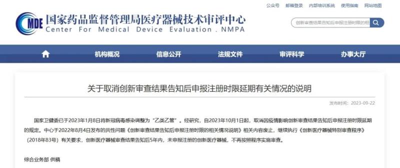 近日,國家藥監(jiān)局器審中心發(fā)布《關(guān)于取消創(chuàng)新審查結(jié)果告知后申報(bào)注冊(cè)時(shí)限延期有關(guān)情況的說明》,其中指出,自2023年10月1日起,取消因疫情影響創(chuàng)新審查結(jié)果告知后申報(bào)注冊(cè)時(shí)限延期的規(guī)定。該中心于2022年8月4日發(fā)布的共性問題《創(chuàng)新審查結(jié)果告知后申報(bào)注冊(cè)時(shí)限的相關(guān)情況說明》相關(guān)內(nèi)容(即“對(duì)于有充分證據(jù)證明確因疫情影響導(dǎo)致注冊(cè)申請(qǐng)延誤的項(xiàng)目,上述時(shí)限可適當(dāng)延長,最長不超過2年”)廢止,繼續(xù)執(zhí)行《創(chuàng)新醫(yī)療器械特別審查程序》(2018年83號(hào))有關(guān)要求,創(chuàng)新醫(yī)療器械審查結(jié)果告知后5年內(nèi),未申報(bào)注冊(cè)的創(chuàng)新醫(yī)療器械,不再按照程序?qū)嵤彶椤?/strong>