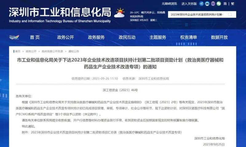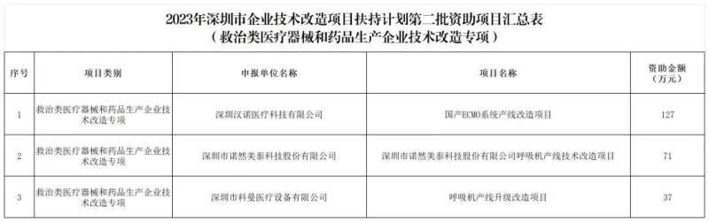 9月26日,深圳市工信局官網發(fā)布通知稱,2023年深圳市救治類醫(yī)療器械和藥品生產企業(yè)技術改造專項扶持計劃已完成項目受理、審核、專項審計、社會公示等環(huán)節(jié),現下達資助計劃,對深圳漢諾醫(yī)療科技有限公司“國產ECMO系統(tǒng)產線改造項目”、深圳市諾然美泰科技股份有限公司“呼吸機產線技術改造項目”等3個項目予以資助 [資助標準:對企業(yè)于2022年12月1日到2023年3月31日期間購買的相關生產設備(含配套軟件),按照不超過生產設備投資的30%予以專項資助] ,其中最高資助金額為127萬元,具體詳情如下: