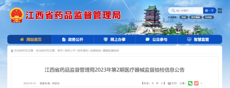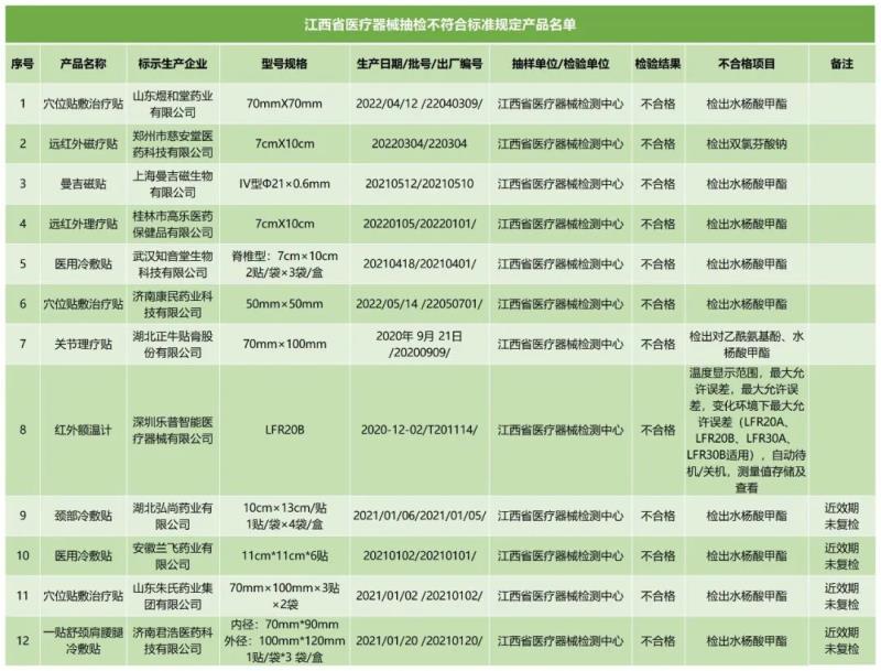 近日,江西省藥品監(jiān)管局發(fā)布2023年第2期醫(yī)療器械監(jiān)督抽檢信息公告。此次共檢出12批次不合格產(chǎn)品,涉及:標稱深圳樂普智能醫(yī)療器械有限公司生產(chǎn)的紅外額溫計(LFR20B)、標稱山東煜和堂藥業(yè)有限公司生產(chǎn)的穴位貼敷治療貼、標稱鄭州市慈安堂醫(yī)藥科技有限公司生產(chǎn)的遠紅外磁療貼等產(chǎn)品,具體如下: