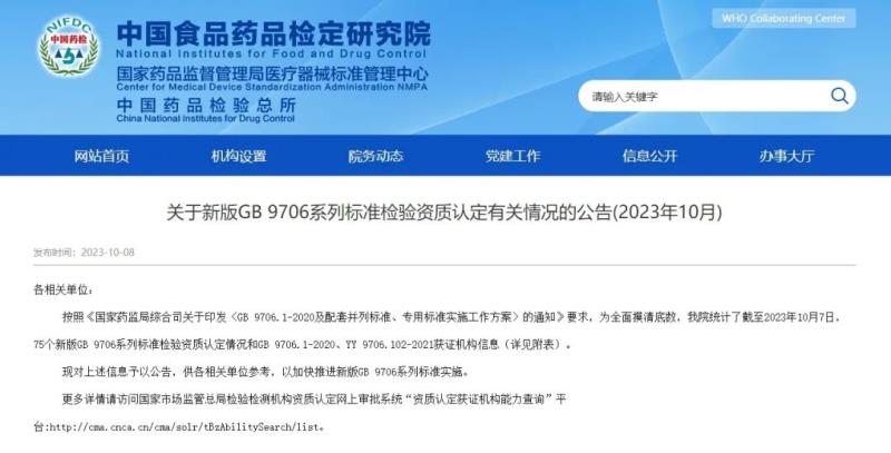 近日,中檢院官網(wǎng)公布了截至2023年10月7日,75個(gè)新版GB 9706系列標(biāo)準(zhǔn)檢驗(yàn)資質(zhì)認(rèn)定情況和GB 9706.1-2020、YY 9706.102-2021獲證機(jī)構(gòu)信息。我們從附件表格中可以看到,全國共有94家(比9月新增2家)GB 9706.1-2020資質(zhì)認(rèn)定獲證機(jī)構(gòu),也就是說,可以承擔(dān)新標(biāo)的安規(guī)檢測(cè)工作,具體如下: