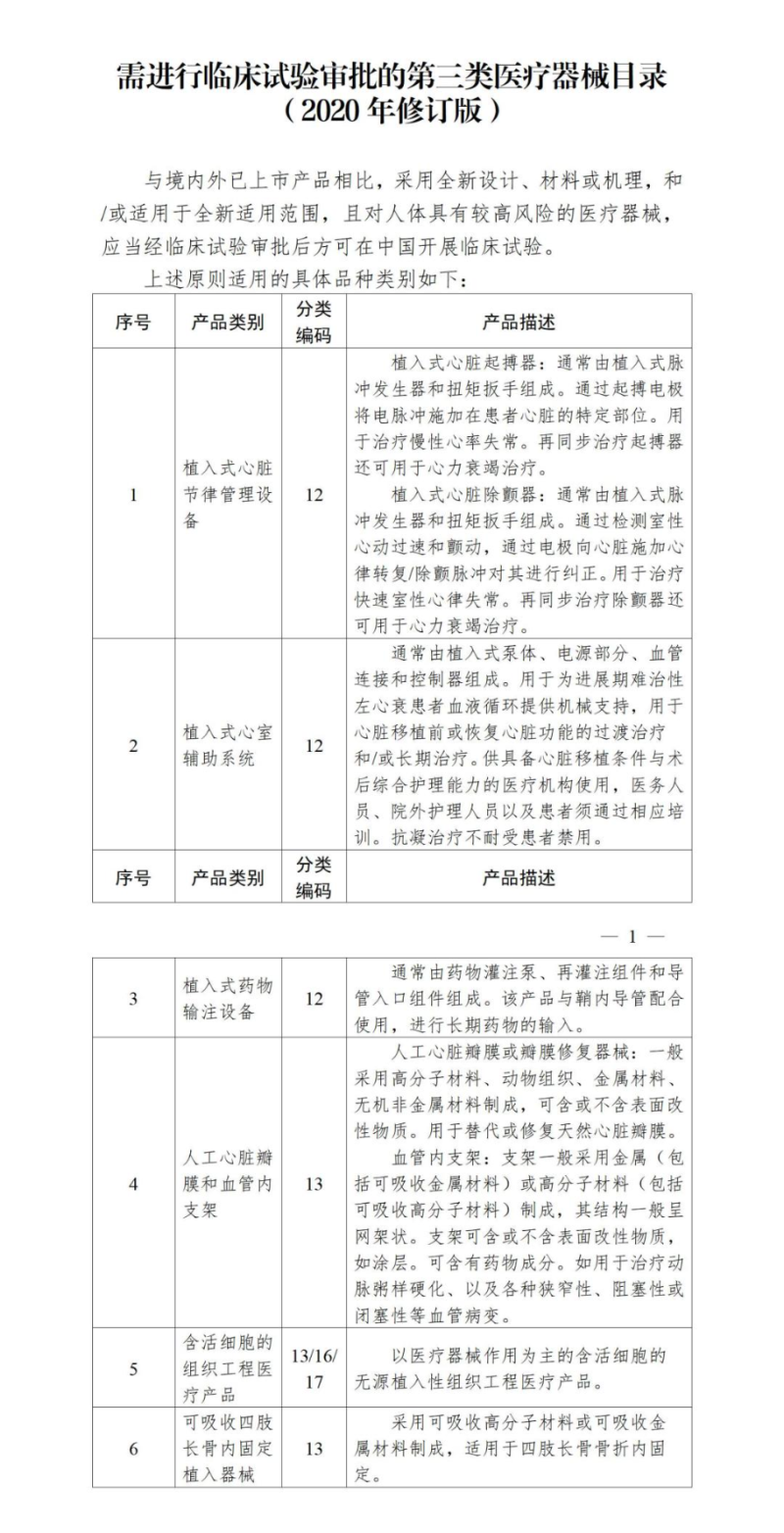 那么目前有哪些醫(yī)療器械產(chǎn)品需進(jìn)行臨床試驗(yàn)審批呢?根據(jù)《國家藥監(jiān)局關(guān)于發(fā)布需進(jìn)行臨床試驗(yàn)審批的第三類醫(yī)療器械目錄(2020年修訂版)的通告(2020年第61號(hào))》,需進(jìn)行臨床試驗(yàn)審批的第三類醫(yī)療器械產(chǎn)品具體如下: