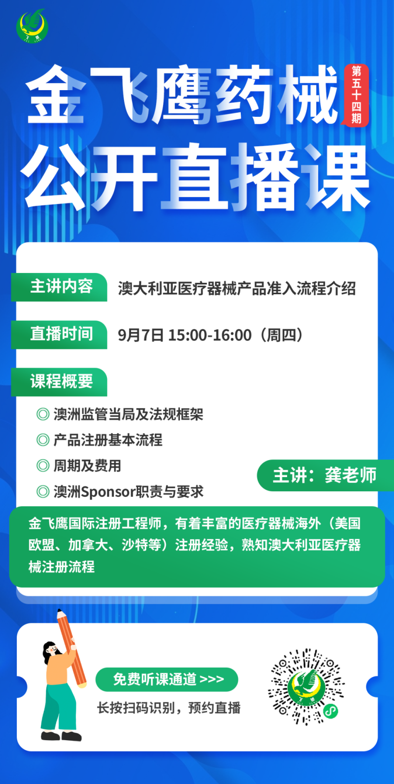9月7日下午3點,大家熟悉的金飛鷹國際注冊工程師龔老師又來啦!她本人有著有著豐富的醫(yī)療器械海外(美國、歐盟、加拿大、沙特等)注冊經(jīng)驗,熟知澳大利亞醫(yī)療器械注冊流程,本次她給大家?guī)怼栋拇罄麃嗎t(yī)療器械產(chǎn)品準入流程介紹》,培訓內(nèi)容包括澳洲監(jiān)管當局及法規(guī)框架、產(chǎn)品注冊基本流程、周期及費用、澳洲Sponsor職責與要求等,有意向?qū)a(chǎn)品銷售至澳大利亞的醫(yī)械企業(yè)千萬不要錯過了哦!