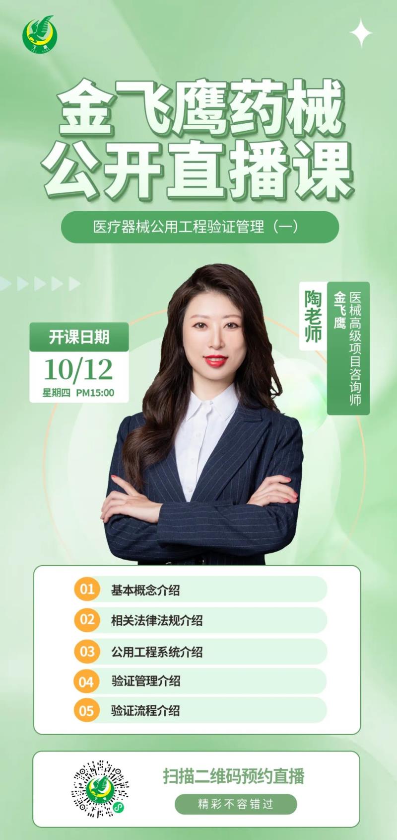 10月12日下午3點,金飛鷹高級項目咨詢師,有著15年工廠管理、7年質(zhì)量經(jīng)理及廠長經(jīng)驗,曾主導(dǎo)多個Ⅱ類&Ⅲ類醫(yī)療器械廠房項目建設(shè)的陶老師,給大家?guī)怼夺t(yī)療器械公用工程驗證管理(一)》,培訓(xùn)內(nèi)容包括基本概念介紹、相關(guān)法律法規(guī)介紹、公用工程系統(tǒng)介紹、驗證管理介紹、驗證流程介紹等,大家千萬不要錯過了哦!