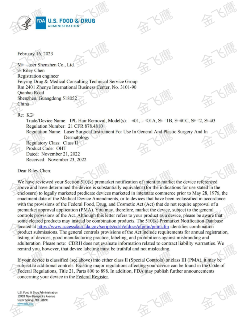 而說到IPL脫毛儀注冊(cè),我估計(jì)不少企業(yè)首先想到的就是金飛鷹。當(dāng)然這并非小編王婆賣瓜,這都是一個(gè)個(gè)案例積累出來的!去年我們跟大家分享過不少IPL脫毛儀國內(nèi)外注冊(cè)案例,比如曾創(chuàng)下了單日取證15張(其中13張為脫毛儀)的“神話”般成績,也曾在一年中拿下了十多個(gè)IPL脫毛儀510(k)號(hào),可能還有不太了解我們的朋友,這里就再帶大家回顧一下?