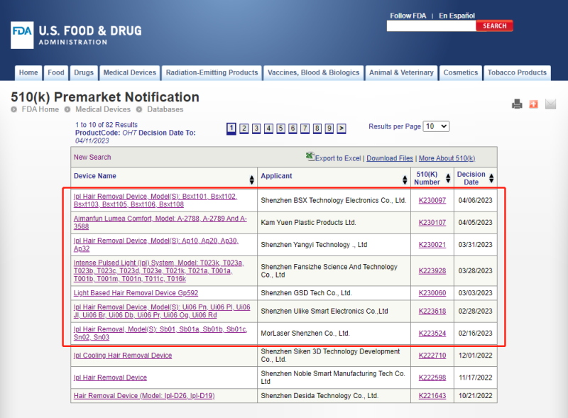 接下來我們照例打開FDA官網(wǎng),按“OHT”代碼檢索并截取了最新數(shù)據(jù)(截至美國時(shí)間2023年4月10日),我們可以看到,2023年FDA官網(wǎng)公布的總共有7款I(lǐng)PL脫毛儀產(chǎn)品,這其中有4款產(chǎn)品的K號(hào)是由金飛鷹申報(bào)的,再加上4月10日新增的暫未在網(wǎng)站顯示的兩個(gè)K號(hào),截至目前總共9個(gè)脫毛儀K號(hào),6個(gè)都是我們做的,占比近70%。