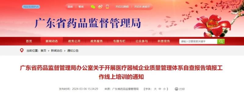 近日,廣東省藥監(jiān)局發(fā)布《關(guān)于開(kāi)展醫(yī)療器械企業(yè)質(zhì)量管理體系自查報(bào)告填報(bào)工作線上培訓(xùn)的通知》,其中指出,凡2023年12月31日前登記注冊(cè)的醫(yī)療器械注冊(cè)人、備案人、受托生產(chǎn)企業(yè)、進(jìn)口醫(yī)療器械代理人,都應(yīng)當(dāng)對(duì)質(zhì)量管理體系運(yùn)行情況進(jìn)行自查,通過(guò)廣東省智慧藥監(jiān)企業(yè)專屬網(wǎng)頁(yè)提交2023年度質(zhì)量管理體系自查報(bào)告。