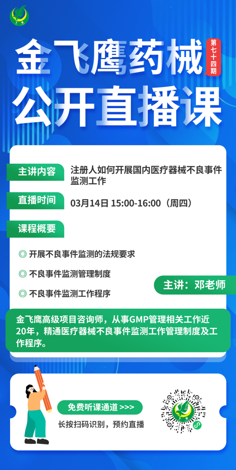 3月14日下午3點(diǎn),金飛鷹高級(jí)項(xiàng)目咨詢師,從事GMP管理相關(guān)工作近20年,精通醫(yī)療器械不良事件監(jiān)測(cè)工作管理制度及工作程序的鄧?yán)蠋煟?/span>給大家?guī)怼蹲?cè)人如何開展國(guó)內(nèi)醫(yī)療器械不良事件監(jiān)測(cè)工作》,培訓(xùn)內(nèi)容包括醫(yī)療器械不良事件監(jiān)測(cè)管理制度、工作程序等,感興趣的企業(yè)千萬(wàn)不要錯(cuò)過了哦!