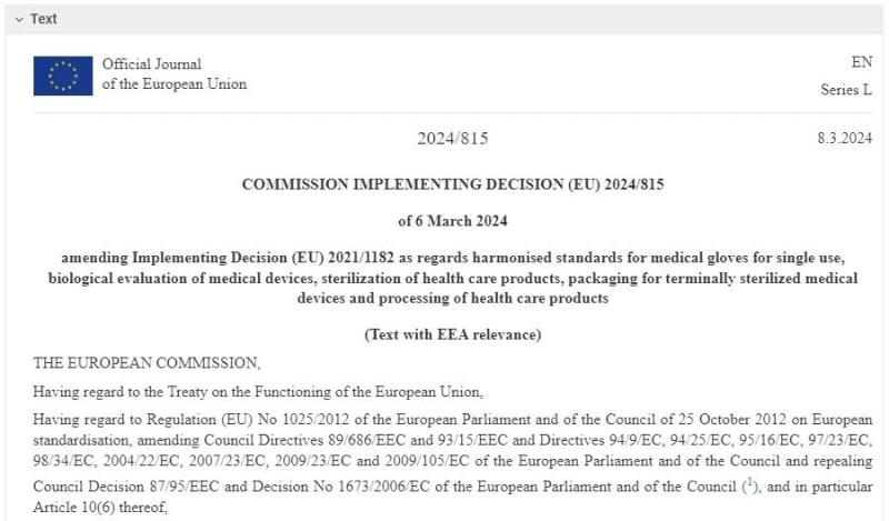 近日,歐盟委員會在官方公報上發(fā)布(EU) 2024/815號執(zhí)行決定,旨在修訂(EU) 2021/1182號決定的附件,新增8項醫(yī)療器械協(xié)調(diào)標(biāo)準(zhǔn)條目。據(jù)悉,(EU) 2021/1182號決定是為支持醫(yī)療器械法規(guī)(EU) 2017/745(MDR) 而起草的醫(yī)療器械協(xié)調(diào)標(biāo)準(zhǔn)參考文獻。
