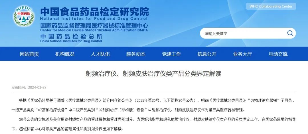 隨著這一監(jiān)管日期的臨近,3月27日,國家藥監(jiān)局醫(yī)療器械標(biāo)準(zhǔn)管理中心對射頻治療儀、射頻皮膚治療儀類產(chǎn)品的管理屬性和類別劃分做出解讀,具體如下: