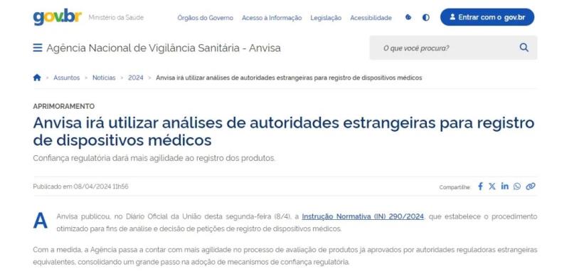 近日,Anvisa發(fā)布第290/2024號規(guī)范性指令,規(guī)定了審核和決定醫(yī)療器械注冊申請的簡化程序經(jīng)認(rèn)可的海外監(jiān)管機(jī)構(gòu)澳洲、加拿大、美國、日本授權(quán)上市的Class Ⅲ、Class Ⅳ類高風(fēng)險醫(yī)療器械,可根據(jù)公司的申請縮短其在巴西注冊的審核時間。此簡化程序的申請需提交相關(guān)文件,以證明進(jìn)入巴西市場的產(chǎn)品與經(jīng)認(rèn)可的監(jiān)管機(jī)構(gòu)批準(zhǔn)的產(chǎn)品有著相同的生產(chǎn)特征、適應(yīng)癥和預(yù)期用途。