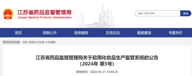 近日,江蘇省藥品監(jiān)督管理局發(fā)布通告,自2024年5月1日起,全省化妝品生產(chǎn)監(jiān)管系統(tǒng)將正式投入使用。相關事宜公告如下: