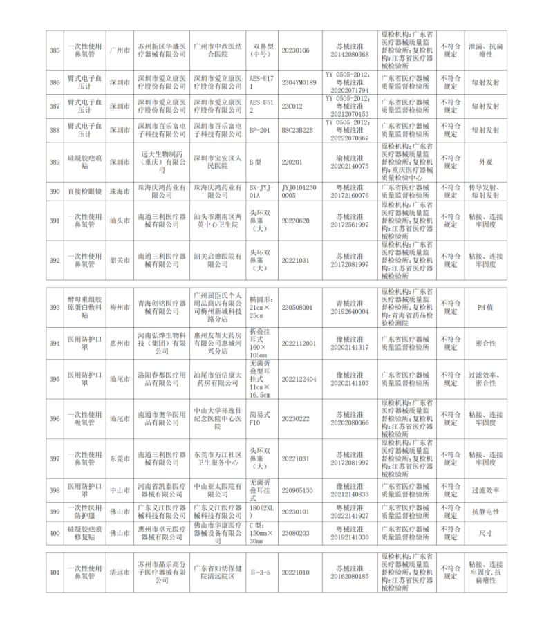 4月26日,廣東藥監(jiān)局發(fā)布《關于醫(yī)療器械抽查檢驗信息的通告(2024年第2期,總第87期)》,我們通過查看通告中的附件發(fā)現,本次共抽查檢驗了401批次產品,其中有17批次不符合規(guī)定,包括硅凝膠疤痕貼、酵母重組膠原蛋白敷料貼、一次性使用鼻氧管、醫(yī)用防護口罩等產品,不符合規(guī)定產品具體明細如下: