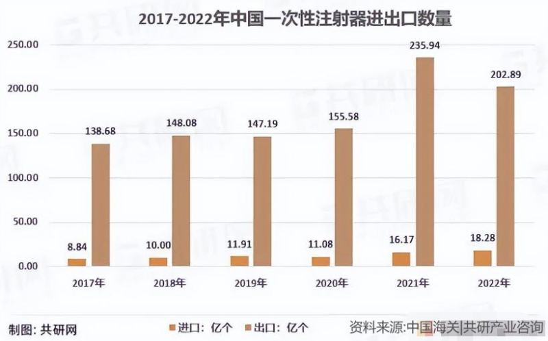 中國(guó)作為一次性注射器的生產(chǎn)大國(guó)和出口大國(guó),其年出口數(shù)量在近年來(lái)有顯著增長(zhǎng)。據(jù)共研網(wǎng)統(tǒng)計(jì),2017-2022年期間,我國(guó)一次性注射器年出口數(shù)量從138.68億個(gè)增加到202.89億個(gè)。如果FDA全面禁止中國(guó)塑料注射器進(jìn)入美國(guó),無(wú)疑將給我國(guó)注射器出口帶來(lái)重大影響。