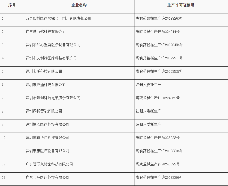 近期,廣東省藥品監(jiān)督管理局組織開展醫(yī)療器械生產企業(yè)監(jiān)督檢查,發(fā)現(xiàn)以下13家企業(yè)質量管理體系存在嚴重缺陷,不符合《醫(yī)療器械生產質量管理規(guī)范》相關規(guī)定,廣東省藥品監(jiān)督管理局已依法采取責令暫停生產的控制措施。