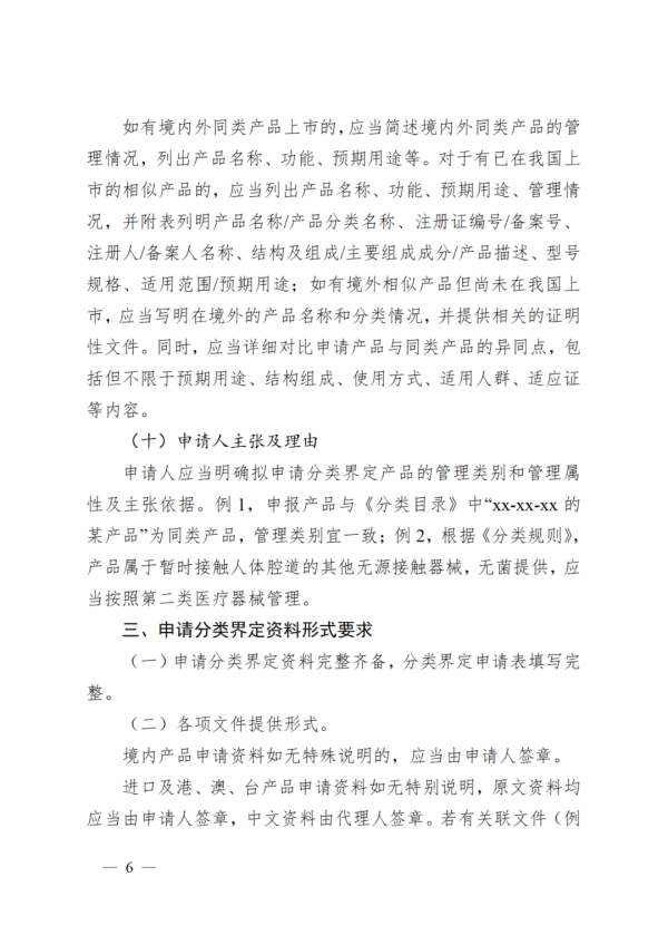 一、關(guān)于分類界定工作 (一)藥品監(jiān)督管理部門應(yīng)當(dāng)向醫(yī)療器械注冊申請人、備案人等提供醫(yī)療器械分類界定服務(wù)。醫(yī)療器械分類界定是藥品監(jiān)督管理部門根據(jù)申請人提供的資料,依據(jù)《醫(yī)療器械監(jiān)督管理條例》(以下簡稱《條例》)《醫(yī)療器械注冊與備案管理辦法》《體外診斷試劑注冊與備案管理辦法》(以下統(tǒng)稱《辦法》)《醫(yī)療器械分類規(guī)則》《體外診斷試劑分類規(guī)則》(以下統(tǒng)稱《分類規(guī)則》)、相關(guān)分類界定指導(dǎo)原則及《醫(yī)療器械分類目錄》《第一類醫(yī)療器械產(chǎn)品目錄》《體外診斷試劑分類目錄》(以下統(tǒng)稱《分類目錄》)等,基于現(xiàn)階段科學(xué)認(rèn)知和共識,并參考國際國內(nèi)醫(yī)療器械分類實踐,綜合考慮醫(yī)療器械的預(yù)期目的、結(jié)構(gòu)組成、使用方法、工作原理等因素,對醫(yī)療器械風(fēng)險程度進(jìn)行評價,判定醫(yī)療器械的管理類別。 (二)申請人應(yīng)當(dāng)依據(jù)《條例》《辦法》《分類規(guī)則》、相關(guān)分類界定指導(dǎo)原則及《分類目錄》等判定產(chǎn)品管理屬性和類別。對新研制的尚未列入《分類目錄》的醫(yī)療器械,申請人可以直接申請第三類醫(yī)療器械產(chǎn)品注冊,也可以依據(jù)《分類規(guī)則》判斷產(chǎn)品類別并申請分類界定后,申請產(chǎn)品注冊或者辦理產(chǎn)品備案。 對于新研制的尚未列入《分類目錄》的醫(yī)療器械或者管理類別存疑的醫(yī)療器械,需要藥品監(jiān)管部門明確分類界定意見從而申請注冊或者辦理備案的,申請人應(yīng)當(dāng)通過分類界定信息系統(tǒng)提出分類界定申請。申請人應(yīng)當(dāng)已完成產(chǎn)品的前期研究、具有基本定型產(chǎn)品,并確保分類界定申請資料的合法、真實、準(zhǔn)確、完整和可追溯。 新研制的尚未列入《分類目錄》的醫(yī)療器械,是指與《分類目錄》中產(chǎn)品(根據(jù)產(chǎn)品描述、預(yù)期用途和品名舉例進(jìn)行綜合判定)和已上市產(chǎn)品相比,產(chǎn)品的主要原材料、生產(chǎn)工藝、工作原理、結(jié)構(gòu)組成、使用方法、接觸部位及接觸時間、預(yù)期目的等均為全新且尚未在我國上市的醫(yī)療器械。 管理類別存疑的醫(yī)療器械,是指同類產(chǎn)品已在我國上市或者已列入《分類目錄》,但與《分類目錄》中同類產(chǎn)品或者已上市同類產(chǎn)品相比,產(chǎn)品的主要原材料、生產(chǎn)工藝、工作原理、結(jié)構(gòu)組成、使用方法、接觸部位及接觸時間、預(yù)期目的等發(fā)生了變化,引入了新的風(fēng)險或者增加了產(chǎn)品風(fēng)險,可能導(dǎo)致產(chǎn)品分類發(fā)生變化的醫(yī)療器械。 (三)對于新研制的尚未列入《分類目錄》的醫(yī)療器械分類界定申請,申請人在分類界定信息系統(tǒng)中提交至國家藥品監(jiān)督管理局醫(yī)療器械標(biāo)準(zhǔn)管理中心(以下簡稱器械標(biāo)管中心)。 器械標(biāo)管中心負(fù)責(zé)組織研究明確分類界定意見,通過分類界定信息系統(tǒng)將分類界定結(jié)果告知申請人,并及時按照程序調(diào)整《醫(yī)療器械分類目錄》。 (四)對于管理類別存疑的境內(nèi)醫(yī)療器械分類界定申請,申請人在分類界定信息系統(tǒng)中提交至所在地省級藥品監(jiān)督管理部門。省級藥品監(jiān)督管理部門負(fù)責(zé)對行政區(qū)域內(nèi)申請人提出的產(chǎn)品分類界定申請進(jìn)行審查,根據(jù)《條例》《分類規(guī)則》、相關(guān)分類界定指導(dǎo)原則及《分類目錄》等能夠明確判定產(chǎn)品管理類別的,通過分類界定信息系統(tǒng)將分類界定結(jié)果告知申請人;難以明確判定產(chǎn)品管理類別的,提出預(yù)分類界定意見,并通過分類界定信息系統(tǒng)報器械標(biāo)管中心。 器械標(biāo)管中心與國家藥品監(jiān)督管理局醫(yī)療器械技術(shù)審評中心(以下簡稱國家藥監(jiān)局器審中心)、省級藥品監(jiān)督管理部門建立醫(yī)療器械分類溝通協(xié)調(diào)機(jī)制,統(tǒng)籌指導(dǎo)省級藥品監(jiān)督管理部門醫(yī)療器械分類界定工作。 對于管理類別存疑的進(jìn)口及港、澳、臺產(chǎn)品醫(yī)療器械分類界定申請,申請人在分類界定信息系統(tǒng)中提交至器械標(biāo)管中心。 器械標(biāo)管中心負(fù)責(zé)對管理類別存疑的進(jìn)口及港、澳、臺產(chǎn)品醫(yī)療器械分類界定申請和省級藥品監(jiān)督管理部門出具預(yù)分類界定意見的醫(yī)療器械分類界定申請組織研究,明確分類界定意見,并通過分類界定信息系統(tǒng)將分類界定結(jié)果告知申請人。 (五)醫(yī)療器械分類技術(shù)委員會按照《國家藥品監(jiān)督管理局醫(yī)療器械分類技術(shù)委員會工作規(guī)則》相關(guān)規(guī)定,開展醫(yī)療器械(含體外診斷試劑)分類及相關(guān)工作,為醫(yī)療器械分類管理工作提供技術(shù)支撐。 (六)申請人、各省級藥品監(jiān)督管理部門、各級醫(yī)療器械技術(shù)審評部門等可登錄分類界定信息系統(tǒng)查詢分類界定結(jié)果。分類界定信息系統(tǒng)告知的產(chǎn)品分類界定結(jié)果,僅供申請醫(yī)療器械注冊或者辦理備案時使用;若注冊或者備案產(chǎn)