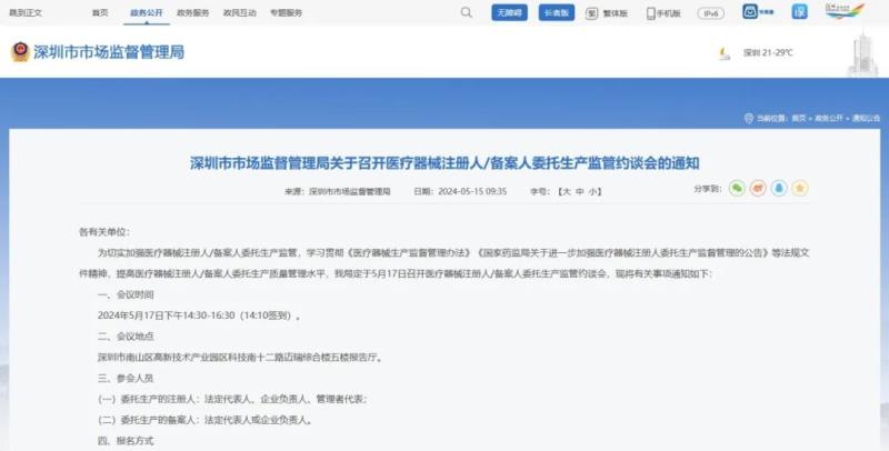 5月15日,深圳市市場(chǎng)監(jiān)督管理局發(fā)布通知稱,該局定于5月17日召開醫(yī)療器械注冊(cè)人/備案人委托生產(chǎn)監(jiān)管約談會(huì),有關(guān)事項(xiàng)具體如下: