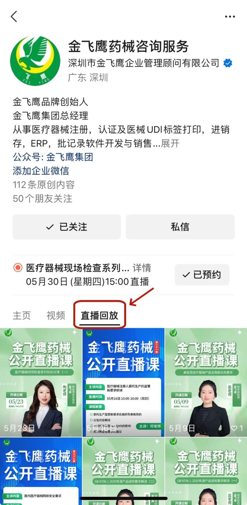 往期直播培訓(xùn)課程支持回放,關(guān)注“金飛鷹藥械咨詢服務(wù)”視頻號并點擊視頻號主頁,即可查看“直播回放”哦~