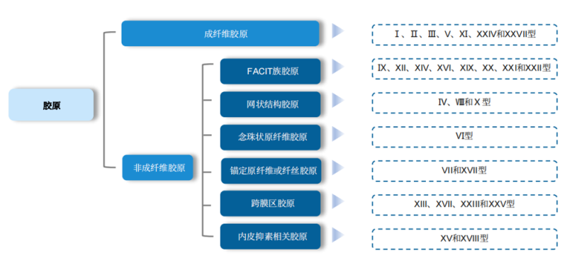 按照被發(fā)現(xiàn)的先后順序,膠原蛋白可分為Ⅰ型膠原、Ⅱ型膠原和Ⅲ型膠原,以此類推。對人體來說,最常見的膠原主要有四種形態(tài):① 膠原Ⅰ型(主要存在于成人皮膚和骨組織,數(shù)量最大);② 膠原Ⅱ型(主要存在于軟骨組織);③ 膠原Ⅲ型(主要存在于嬰幼兒皮膚或血管、內膜、腸、胃器官);④ 膠原Ⅳ型(主要存在于各組織器官的基底膜、胎盤和晶狀體)。
