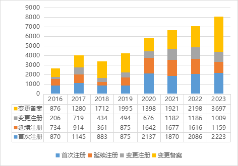 ↑ 圖 3 2016至2023年度廣東省第二類醫(yī)療器械注冊數(shù)據(jù)圖