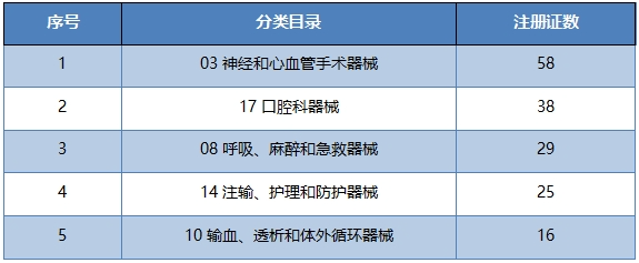 ↑ 圖 4 首次注冊第二類有/無源醫(yī)療器械審批數(shù)量前五位