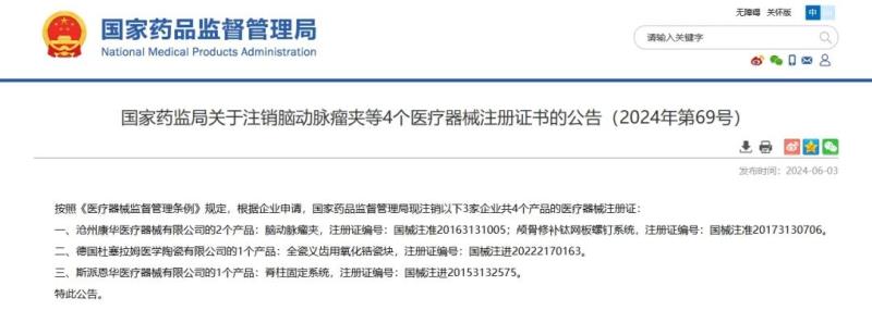 6月3日,國家藥監(jiān)局發(fā)布一則醫(yī)療器械注冊證注銷公告,公告顯示,該局已依法注銷滄州康華醫(yī)療器械有限公司、德國杜塞拉姆醫(yī)學陶瓷有限公司等3家企業(yè)共計4個產品的醫(yī)療器械注冊證,具體如下: