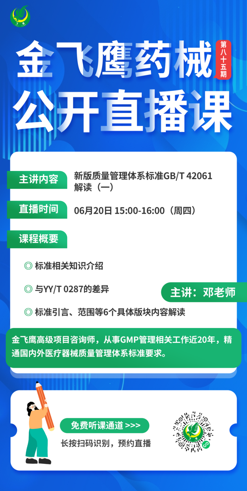 6月20日下午3點(diǎn),金飛鷹高級項(xiàng)目咨詢師,從事GMP管理相關(guān)工作近20年,精通國內(nèi)外醫(yī)療器械質(zhì)量管理體系標(biāo)準(zhǔn)要求的鄧?yán)蠋?/span>,給大家?guī)怼缎掳驷t(yī)療器械質(zhì)量管理體系標(biāo)準(zhǔn)GB/T 42061解讀(一)》,培訓(xùn)內(nèi)容包括標(biāo)準(zhǔn)相關(guān)知識介紹、與YY/T 0287的差異、標(biāo)準(zhǔn)引言/范圍等6個(gè)具體版塊內(nèi)容解讀,醫(yī)療器械經(jīng)營企業(yè)千萬不要錯(cuò)過了哦!