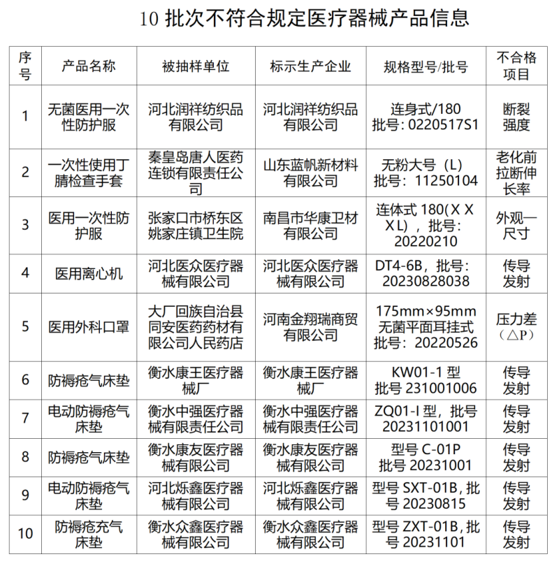 為加強(qiáng)醫(yī)療器械質(zhì)量監(jiān)督管理,保障醫(yī)療器械質(zhì)量安全有效,按照《醫(yī)療器械監(jiān)督管理?xiàng)l例》及《河北省醫(yī)療器械監(jiān)督抽驗(yàn)管理辦法》有關(guān)規(guī)定,河北省藥品監(jiān)督管理局組織對2023年全省生產(chǎn)、經(jīng)營和使用等環(huán)節(jié)醫(yī)療器械進(jìn)行了質(zhì)量監(jiān)督抽檢,發(fā)現(xiàn)10批次產(chǎn)品不符合標(biāo)準(zhǔn)規(guī)定,并已依法分別予以查處,現(xiàn)予以公開。