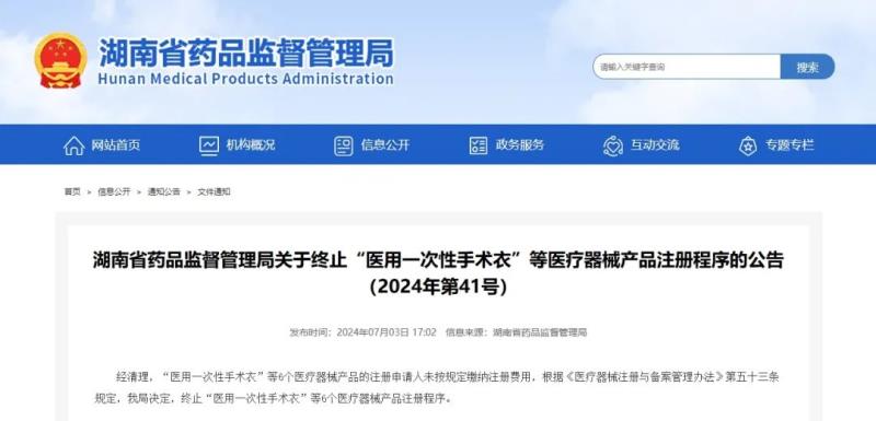 7月3日,湖南藥監(jiān)局發(fā)布公告稱,“醫(yī)用一次性手術(shù)衣”“醫(yī)用皮膚修復(fù)膜”等6個醫(yī)療器械產(chǎn)品的注冊申請人未按規(guī)定繳納注冊費(fèi)用,根據(jù)《醫(yī)療器械注冊與備案管理辦法》第五十三條規(guī)定,該局決定終止這6個醫(yī)療器械產(chǎn)品注冊程序,具體明細(xì)如下: