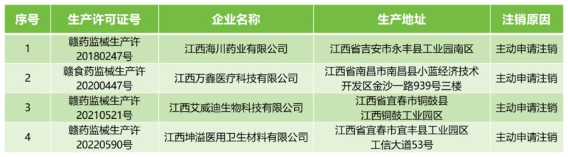 7月17日,江西省藥監(jiān)局發(fā)布公告稱,該局已依法注銷江西海川藥業(yè)有限公司、江西萬鑫醫(yī)療科技有限公司等4家企業(yè)的《醫(yī)療器械生產(chǎn)許可證》,注銷原因均為“企業(yè)主動申請注銷”,具體明細(xì)如下: