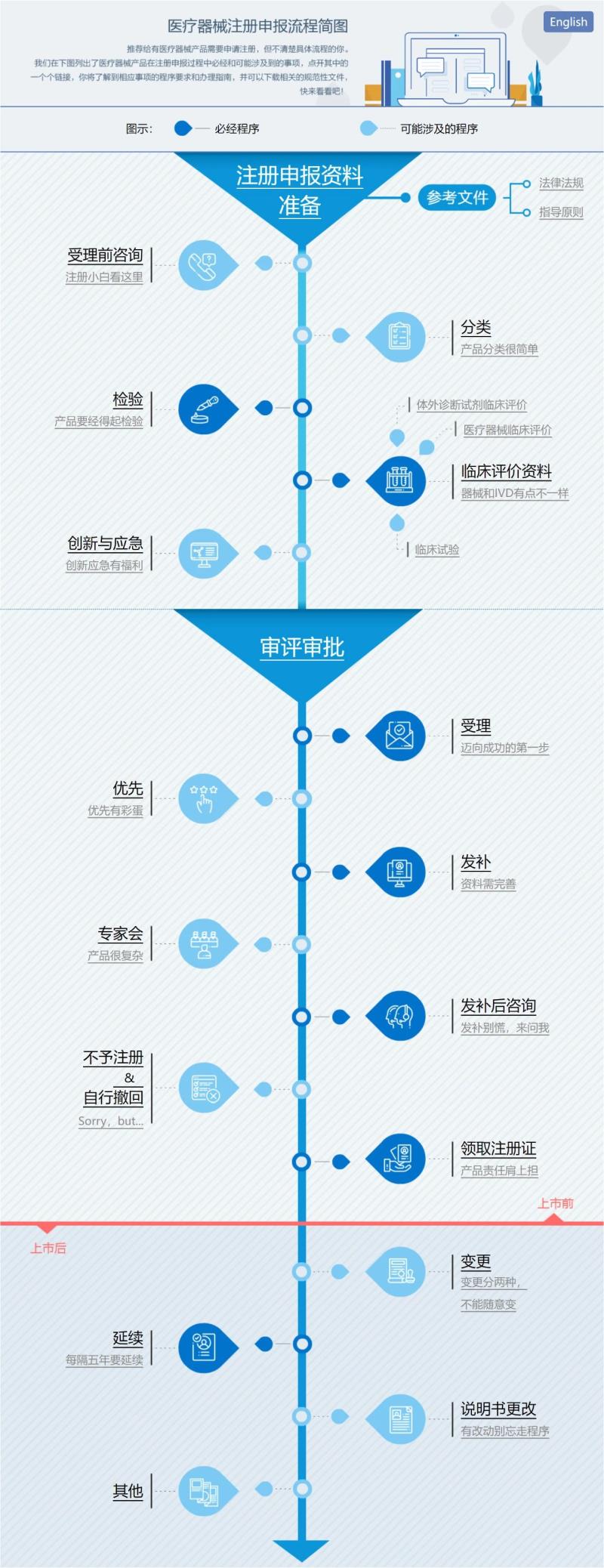 眾所周知,醫(yī)療器械注冊(cè)申報(bào)是一項(xiàng)較為繁瑣的工作,需要經(jīng)歷產(chǎn)品送檢、注冊(cè)資料編寫&提交、審評(píng)發(fā)補(bǔ)等諸多環(huán)節(jié),且每一環(huán)節(jié)都有相應(yīng)注意事項(xiàng),本期文章我們就轉(zhuǎn)載了國家藥監(jiān)局器審中心公開的《醫(yī)療器械注冊(cè)申報(bào)流程簡(jiǎn)圖》,以供大家參考~