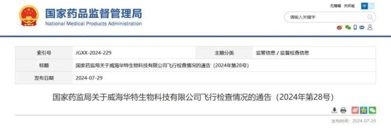 7月29日,國家藥監(jiān)局發(fā)布通告稱,該局組織檢查組對(duì)威海**生物科技有限公司進(jìn)行飛行檢查,發(fā)現(xiàn)該企業(yè)質(zhì)量管理體系主要存在以下缺陷: