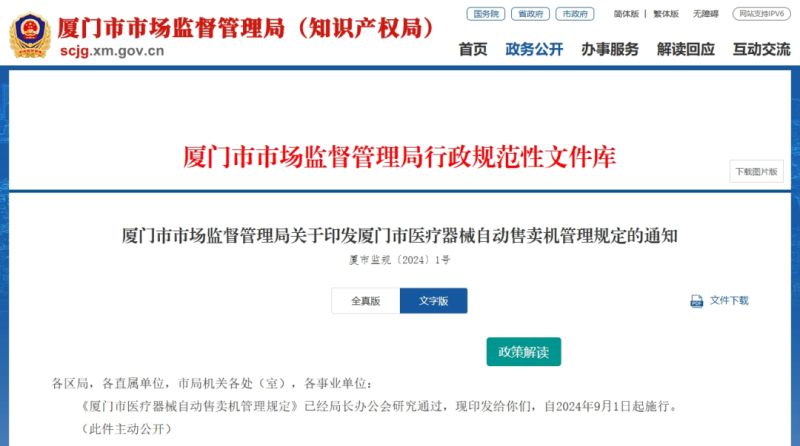 近日,廈門市市場監(jiān)督管理局發(fā)布《廈門市醫(yī)療器械自動售賣機管理規(guī)定》(以下簡稱《管理規(guī)定》),對醫(yī)療器械經(jīng)營企業(yè)設(shè)置自動售械機的備案流程予以明確,并對自動售械機的經(jīng)營主體、經(jīng)營范圍、基本原則以及質(zhì)量管理體系等提出要求。