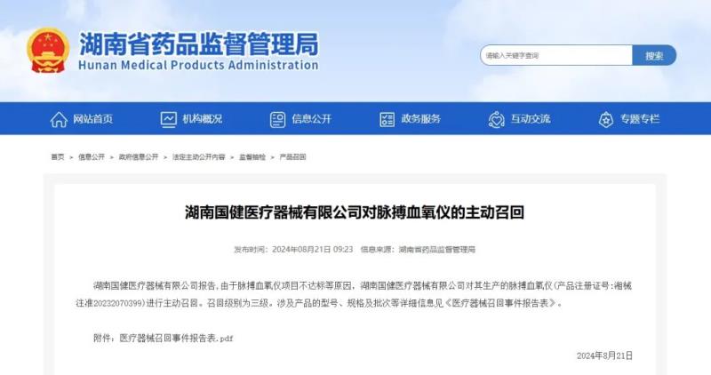 8月21日,湖南省藥監(jiān)局官網發(fā)布一則召回公告,其中提到,由于脈搏血氧儀項目不達標等原因,湖南國健醫(yī)療器械有限公司對其生產的脈搏血氧儀(產品注冊證號:湘械注準20232070399)進行主動召回。召回級別為三級。通過查看附件《醫(yī)療器械召回事件報告表》我們可以發(fā)現(xiàn),涉及產品已在中國銷售49臺。