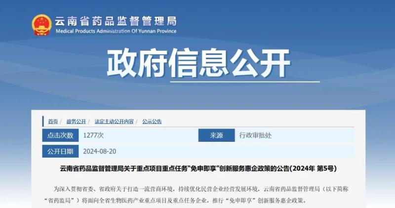 近日,云南省藥監(jiān)局發(fā)布公告稱,為深入貫徹省委、省政府關于打造一流營商環(huán)境,持續(xù)優(yōu)化民營企業(yè)經(jīng)營發(fā)展環(huán)境,該局將面向全省生物醫(yī)藥產(chǎn)業(yè)重點項目及重點任務企業(yè),推行“免申即享”創(chuàng)新服務惠企政策。具體如下: