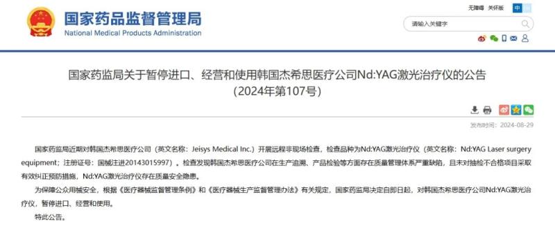 為保障公眾用械安全,根據(jù)《醫(yī)療器械監(jiān)督管理條例》和《醫(yī)療器械生產(chǎn)監(jiān)督管理辦法》有關(guān)規(guī)定,國家藥監(jiān)局決定自即日起,對韓國杰希思醫(yī)療公司Nd:YAG激光治療儀,暫停進口、經(jīng)營和使用。