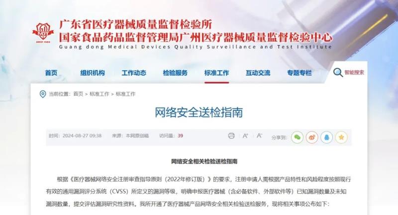 近日,廣東省醫(yī)療器械質(zhì)量監(jiān)督檢驗(yàn)所就醫(yī)療器械產(chǎn)品網(wǎng)絡(luò)安全相關(guān)檢驗(yàn)送檢事項(xiàng)公布如下: