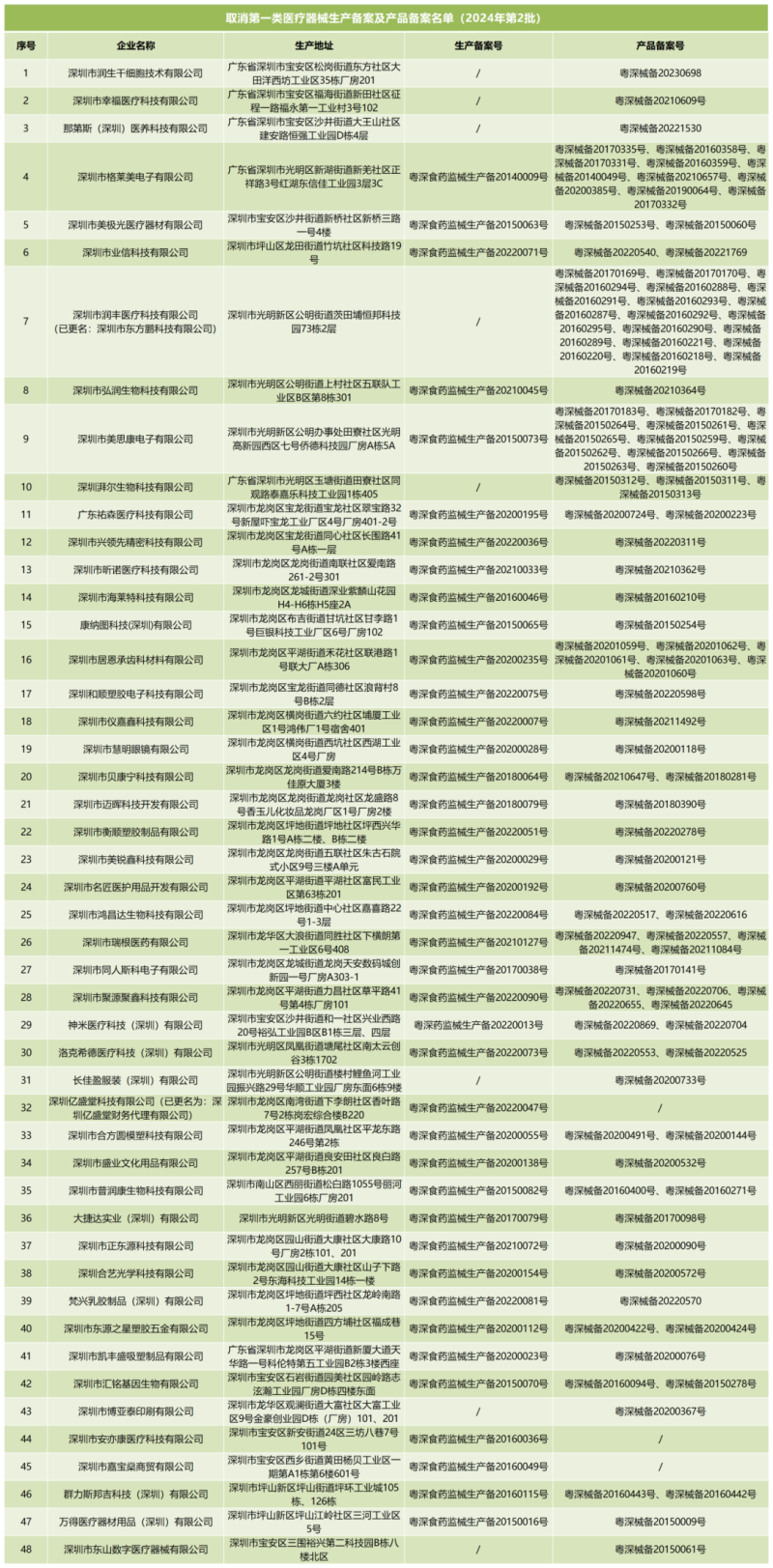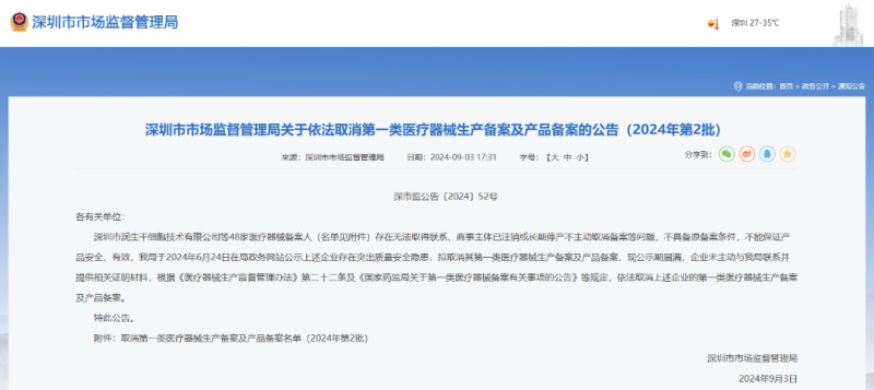 9月3日,深圳市市場監(jiān)督管理局官網(wǎng)發(fā)布一則取消第一類醫(yī)療器械生產(chǎn)備案及產(chǎn)品備案的公告,該公告指出,因深圳市潤生干細胞技術(shù)有限公司、深圳市幸福醫(yī)療科技有限公司、深圳市格萊美電子有限公司等48家醫(yī)療器械備案人存在無法取得聯(lián)系、商事主體已注銷或長期停產(chǎn)不主動取消備案等問題,不具備原備案條件,不能保證產(chǎn)品安全、有效,該局在公示期結(jié)束后決定取消這些企業(yè)名下的第一類醫(yī)療器械生產(chǎn)備案及產(chǎn)品備案,具體明細如下: