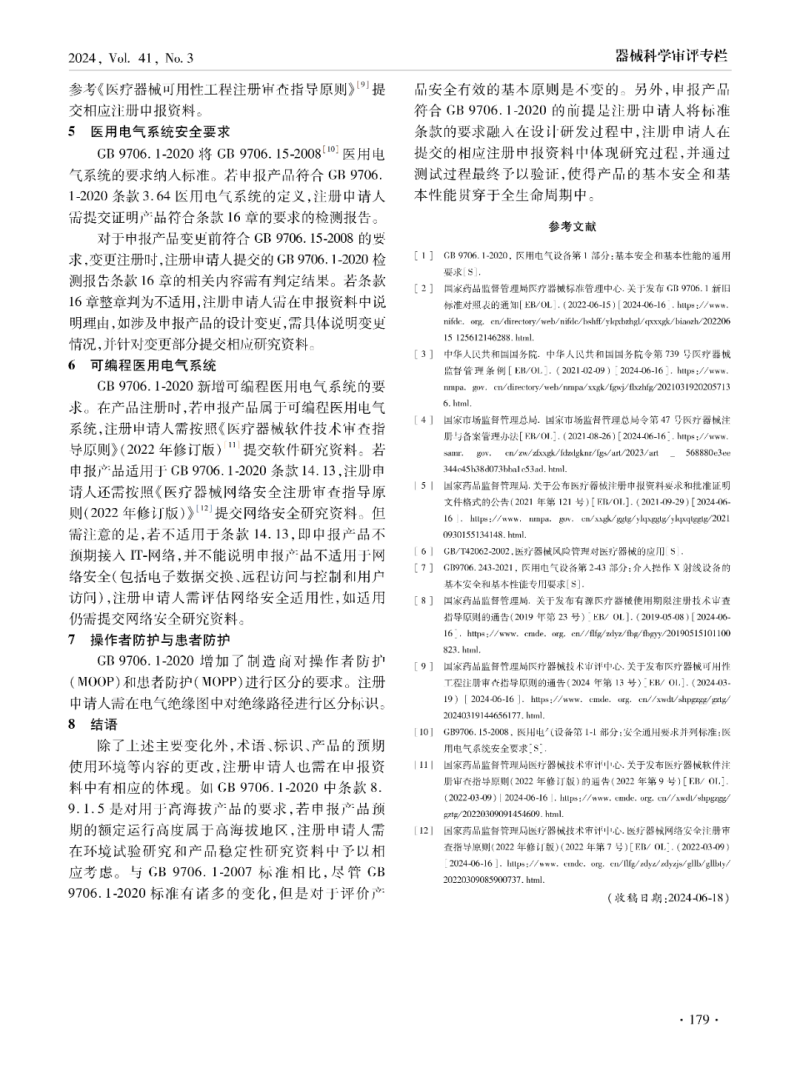 GB 9706.1-2020《醫(yī)用電氣設(shè)備第1 部分:基本安全和基本性能的通用要求》已于2023年5月1日起實施。該標(biāo)準(zhǔn)是強制性國家標(biāo)準(zhǔn),替代GB 9706.1-2007《醫(yī)用電氣設(shè)備第1部分:安全通用要求》,相較于GB 9706.1-2007,該標(biāo)準(zhǔn)新增風(fēng)險管理、基本性能、預(yù)期使用壽命、可用性的要求,并入醫(yī)用電氣系統(tǒng)安全要求和可編程醫(yī)用電氣系統(tǒng)的要求,以及新增區(qū)分操作者防護與患者防護等內(nèi)容。本文從上述標(biāo)準(zhǔn)主要變化內(nèi)容分析技術(shù)審評關(guān)注點,以期對注冊申請人準(zhǔn)備注冊申報資料及監(jiān)管部門人員技術(shù)審評帶來幫助。