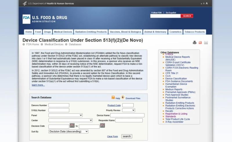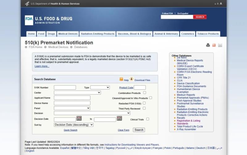 該數(shù)據(jù)庫(kù)包含所有通過(guò)510(k)路徑在美國(guó)上市的醫(yī)療器械信息。值得注意的是,該網(wǎng)址有一個(gè)最近更新日期,部分剛拿到510(k)號(hào)的產(chǎn)品可能查詢(xún)不到,等FDA官網(wǎng)信息更新后即可查詢(xún)。